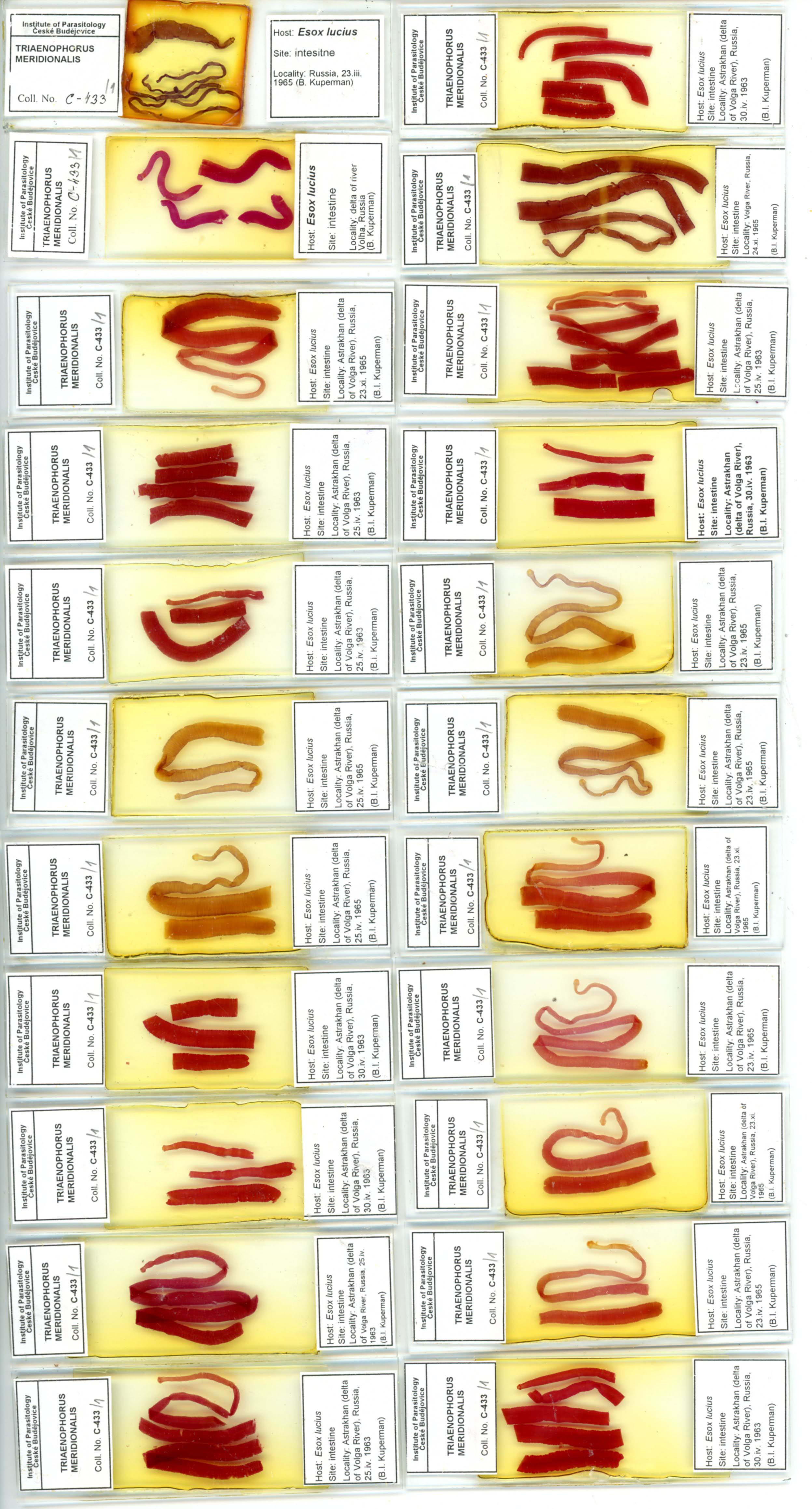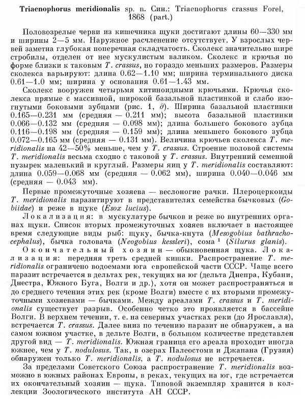 | Locality Notes | -The distribution of T. meridionalis is limited to water bodies in the south of the European part of the USSR. Most often, the parasite occurs in the deltas of rivers flowing south (delta of the Dnieper, Kuban, Dniester, Southern Bug, Volga, etc.), although it can also spread to the middle reaches of these rivers (except for the Volga) along with their second intermediate hosts - gobies . |