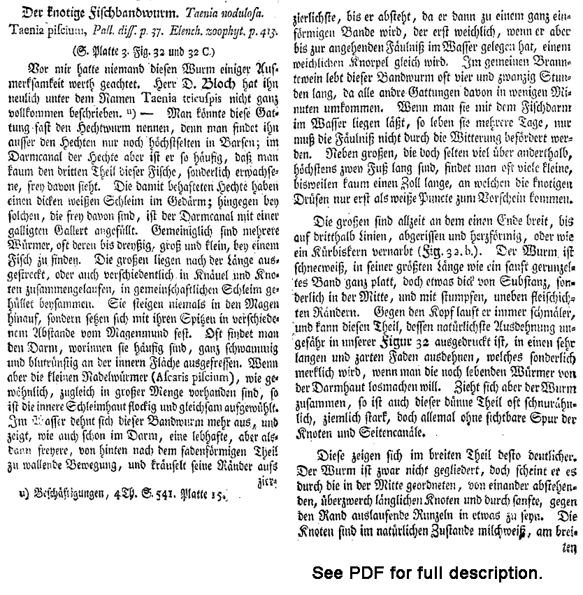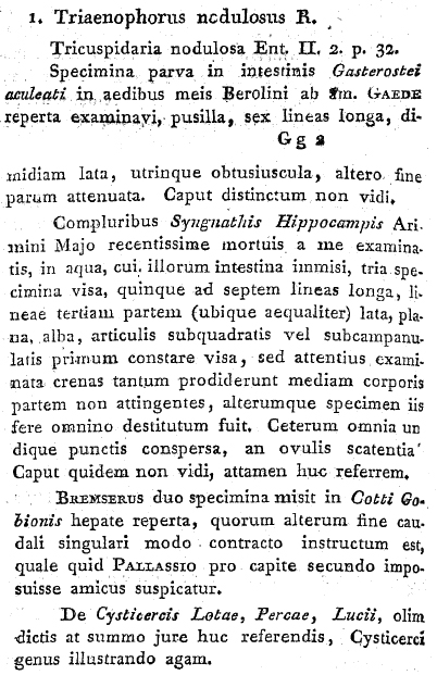 Rudolphi, C. A. 1819. Entozoorum synopsis, cui accedunt mantissa duplex et indices locupletissimi. Sumtibus Augusti Rücker, Berolini (Berlin), 811 pp. (14) Download PDF |