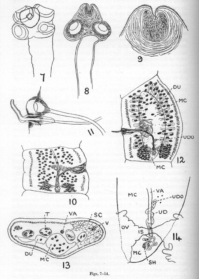 Figs. 7-14. Proteocephalus beddardi. Fig. 7. Scolex in outline. (x 116). Fig. 8. Another view of the scolex showing the apical organ (muscular rostellum?). (x 116). Fig. 9. The apical organ seen in optical section, with the spinelets. (x 346). Fig. 10. A young mature proglottid. Dorsal view. (x 52.) Fig. 11. The cirrus sac, armed cirrus and vaginal opening from the ventral aspect. The vaginal opening is somewhat distorted. (x 74.) Fig. 12. Ripe proglottid, much flattened, in dorsal view. Note the wide median chamber of the uterus sac and the presence of the uterus below the ovary. (x 23). Fig. 13. Transverse section (anterior to the uterine canal) across a young ripe proglottid. Note absence of the internal longitudinal muscle sheath. (x 116). Fig. 14. The ducts in the region of the ovarian isthmus, viewed from the dorsal side. (x 74.) DU, diverticula of uterus; IS, isthmus of ovary; MC, median chamber of uterus; OV; ovary; SC, nuclear layer of subcuticula; SH, shell gland; T, testes; UD, uterine canal; UDO, opening of uterine canal into median chamber of uterus sac; V, vitellaria; VA, vagina.