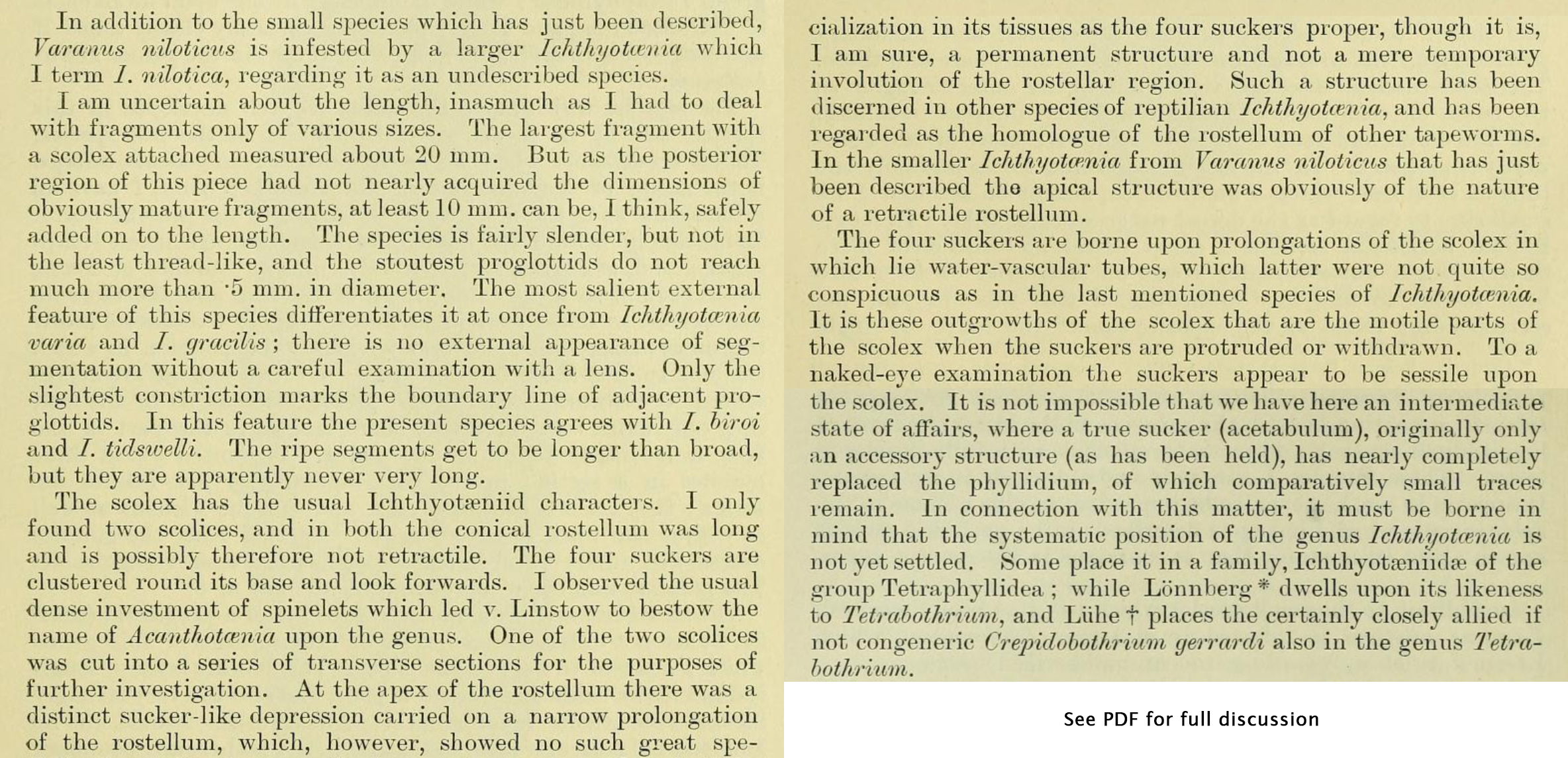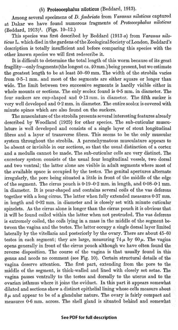 Beddard, F. E. 1913. Contributions to the anatomy and systematic arrangement of the Cestoidea. VII. On six species of tapeworms from reptiles, belonging to the genus Ichthyotaenia (s. l.). Proceedings of the Zoological Society of London 1913(1): 4-36. (3970) Download PDFBaer, J. G. 1927. Contributions to the anatomy of some reptilian cestodes. Parasitology 19: 274-283. (4100) Download PDF |