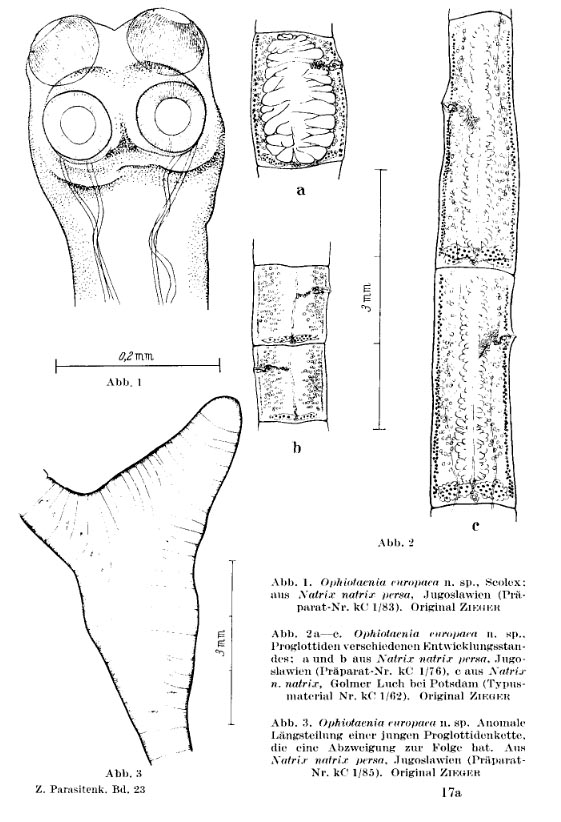 | Specimen Notes | Helminthensammlung Zoologische Forschungsstelle im Berliner Tierpark, Nr. kC 1/60-65, aus Natrix natrix (L.), Golmer Luch bei Potsdam (s. Abb. 2c). |