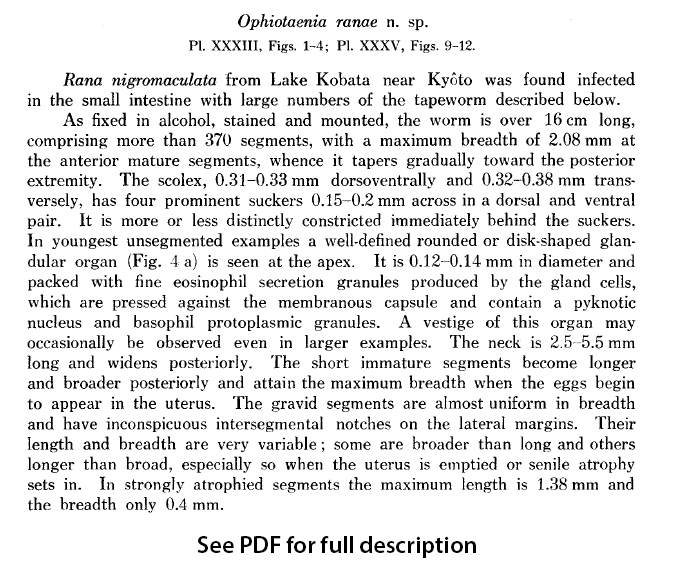 | Synonyms | Ophiotaenia ranarum Iwata & Matuda, 1938 |