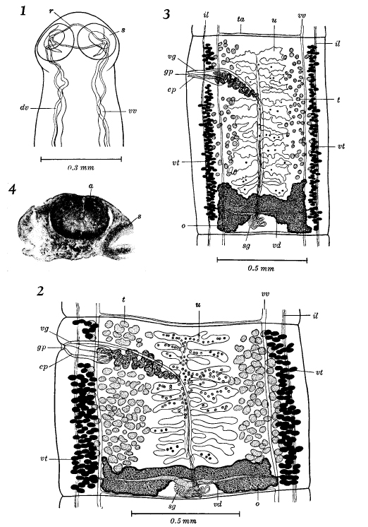 Pl. XXXIII. Ophiotaenia ranae n. sp. Fig. 1. Scolex; ventral view. Fig. 2. Gravid segment; ventral view. Fig. 3. Segment with empty uterus; ventral view. Fig. 4. Section of scolex of youngest sample showing apical organ; x200.