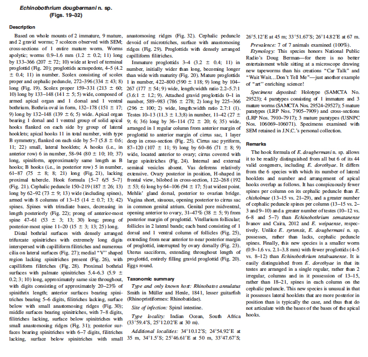 | Total Number of Type Specimens | whole mounts of 2 immature, 9 mature, and 2 gravid worms; 7 scoleces observed with SEM; cross sections of 1 entire mature worm |