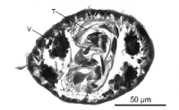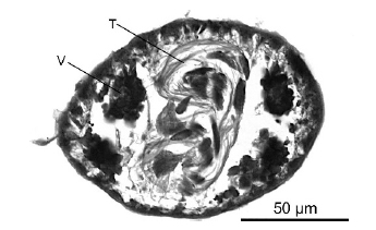 Figure 25. Histological section through testis of Echinobothrium dougbermani n. sp. (LRP No. 7915) (T, testis; V, vitelline follicle).