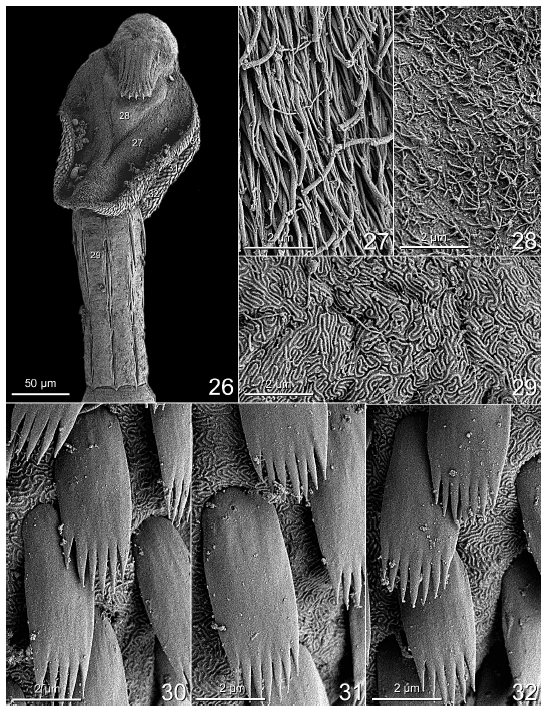 Figures 26–32. Scanning electron micrographs of Echinobothrium dougbermani n. sp. 26. Scolex (small inset numbers correspond to regions presented under higher magnification in Figs. 27–32). 27. Detail of lateral region of distal bothrial surface. 28. Detail of spinithrix-free medial ‘‘V’’-shaped region of distal bothrial surface. 29. Detail of surface of cephalic peduncle. 30. Detail of anterior proximal surface. 31. Detail of middle proximal surface. 32. Detail of posterior proximal surface.