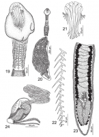22. Cephalic peduncle spines shown in order from anterior to posterior (paratype USNPC No. 106071). 23. Mature proglottid