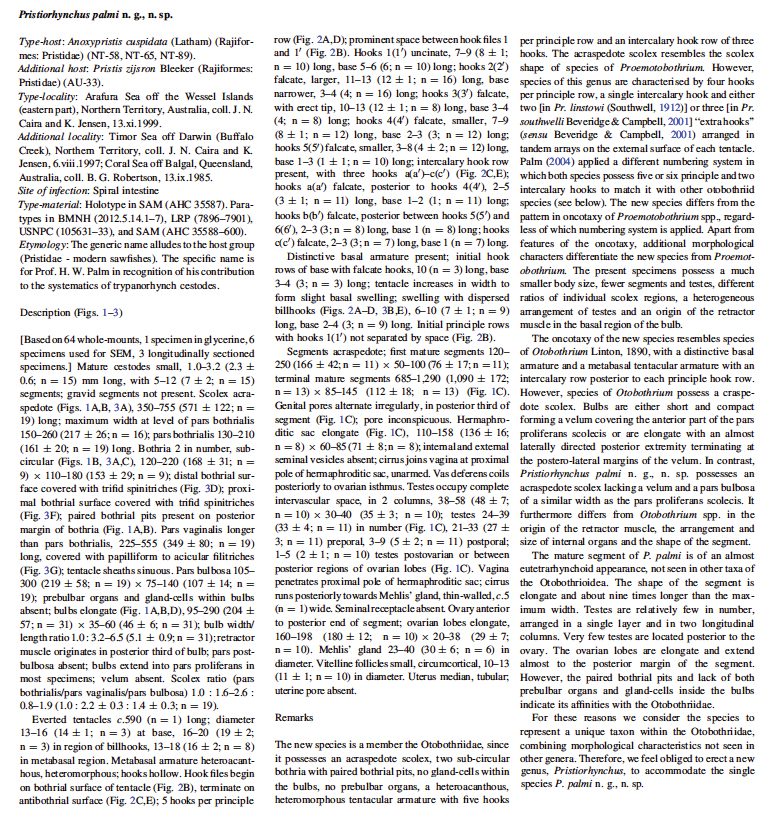 s... MoreFig. 2 Pristiorhynchus palmi n. g., n. sp. from Anoxypristis cuspidata in theArafura Sea (A,D,E) and from Pristis zijsron in the Coral Sea (B,C). A, basal andmetabasal tentacular armature, external