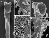 Fig. 3 Scanning electron micrographs of Pristiorhynchus palmi n. g., n. sp. from Anoxypristis cuspidata in the Arafura Sea. A, scolex, dorso-ventral view; B, basal tentacular armature, antibothrial su... MoreFig. 3 Scanning electron micrographs of Pristiorhynchus palmi n. g., n. sp. from Anoxypristis cuspidata in the Arafura Sea. A, scolex, dorso-ventral view; B, basal tentacular armature, antibothrial surface showing characteristic erect billhooks; C, pars bothrialis, oblique dorso-ventral view; D, distal bothrial surface showing trifid spinitriches; E, basal tentacular armature, external surface showing billhooks; F, proximal bothrial surface showing trifid spinitriches; G, pars vaginalis covered with papilliform to acicular filitriches |