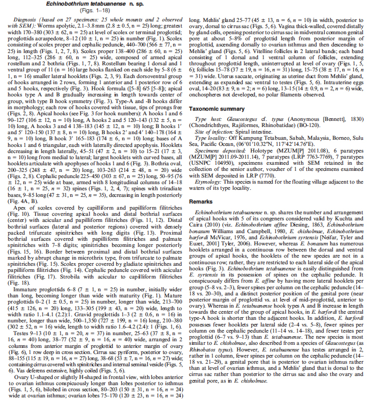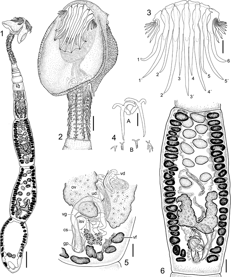 FIGURES 1–6. Echinobothrium tetabuanense n. sp., line drawings. (1) Entire worm in ventral view, scale bar = 200 µm. (2) Scolex, scale bar = 50 µm. (3) Apical armature, dorsoventral view, 1–6 type-A h... MoreFIGURES 1–6. Echinobothrium tetabuanense n. sp., line drawings. (1) Entire worm in ventral view, scale bar = 200 µm. (2) Scolex, scale bar = 50 µm. (3) Apical armature, dorsoventral view, 1–6 type-A hooks, 1'–5' type-B hooks, scale bar = 25 µm. (4) Detail of spines on the cephalic peduncle: (A) Anteriormost spines, (B) posteriormost spines, scale bar = 22 µm. (5) Detail of terminal genitalia in dorsal view, scale bar = 35 µm. (6) Gravid proglottid