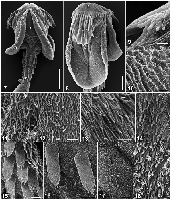 indicate locations of details shown in Figures 14, 16, a... MoreFIGURES 7–18. Echinobothrium tetabuanense n. sp., scanning electron micrographs. (7) Lateral view of scolex, scale bar = 100 µm. Small numbers