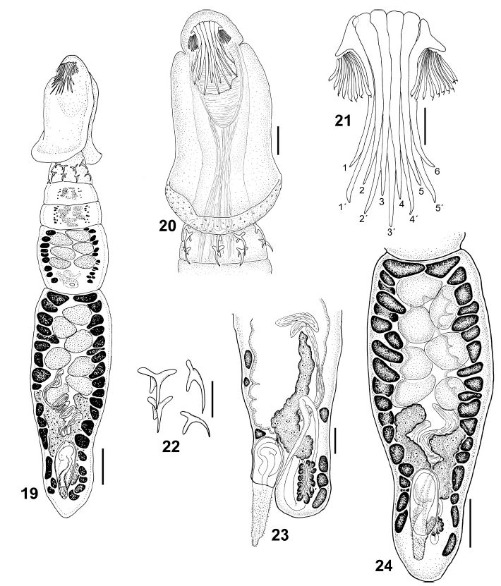 FIGURES 19–24. Echinobothrium sematanense n. sp., line drawings. (19) Entire worm, scale bar = 50 µm. (20) Scolex, scale bar = 20 µm. (21) Apical armature, dorsoventral view, 1–6 type-A hooks, 1'–5' t... MoreFIGURES 19–24. Echinobothrium sematanense n. sp., line drawings. (19) Entire worm, scale bar = 50 µm. (20) Scolex, scale bar = 20 µm. (21) Apical armature, dorsoventral view, 1–6 type-A hooks, 1'–5' type-B hooks, scale bar = 10 µm. (22) Detail of spines on the cephalic peduncle, scale bar = 10 µm. (23) Detail of terminal genitalia, lateral view, scale bar = 25 µm. (24) Gravid proglottid, ventral view, scale bar = 50 µm. |