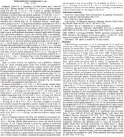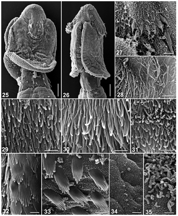 indicate locations of details shown in Figures 29–31, 33–34. (26) Scolex, lateral view, scale bar = 20 µm. Small numbers indicate locations of details shown in Figures 27, 28, 32, 35. (27) Detail of hooklets, scale bar = 3 µm. (28) Apex of scolex surface, scale bar = 1.5 µm. (29) Central region of distal bothrial surface, scale bar = 1 µm. (30) Lateral and posterior regions of distal bothrial surface, scale bar = 1 µm. (31) Surface of tissue covering hooks, scale bar = 1 µm. (32) Proximal bothrial surface, anterior regions, scale bar = 1 µm. (33) Proximal bothrial surface, posterior region, scale bar = 1 µm. (34) Cephalic peduncle surface, scale bar = 1 µm. (35) Surface of immature proglottid, scale bar = 1 µm. |