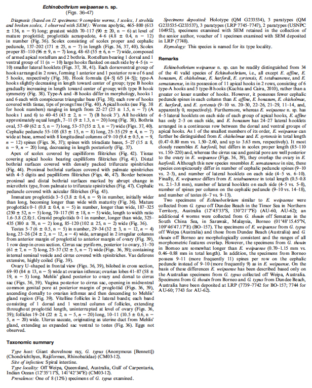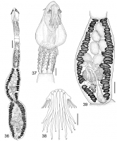 FIGURES 36–39. Echinobothrium weipaense n. sp. line drawings. (36) Entire worm, scale bar = 50 µm. (37) Scolex, scale bar = 15 µm. (38) Apical armature, dorsoventral view, 1–6 apical hooks type A, 1'–... MoreFIGURES 36–39. Echinobothrium weipaense n. sp. line drawings. (36) Entire worm, scale bar = 50 µm. (37) Scolex, scale bar = 15 µm. (38) Apical armature, dorsoventral view, 1–6 apical hooks type A, 1'–5' apical hooks type B, scale bar = 10 µm. (39) Mature proglottid, dorsal view, scale bar = 30 µm. |