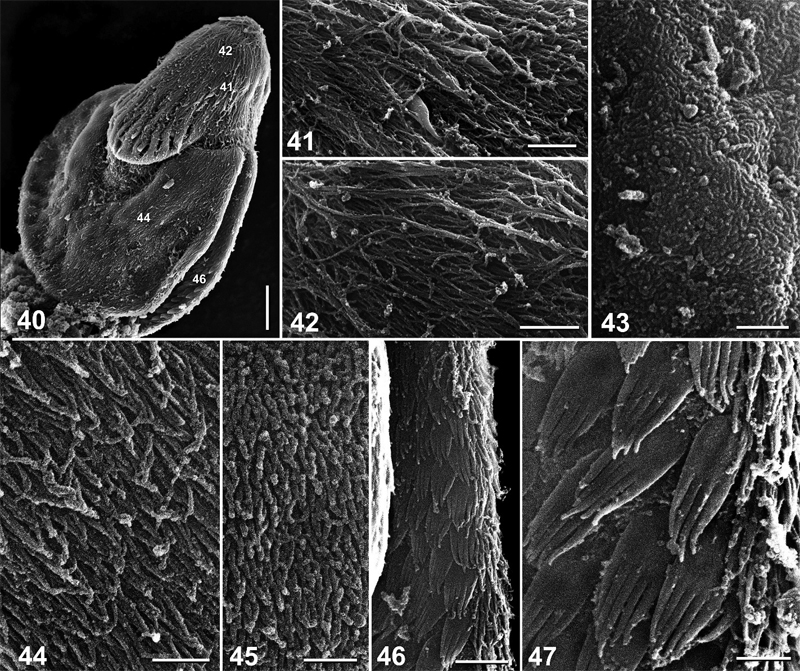 (43) Cephalic peduncle surface, scale bar = 1 µm. (44) Distal bothrial surface, scale bar = 1 µm. (45) Immature proglottid surface, scale bar = 0.8 µm. (46) Proximal bothrial surface, scale bar = 2 µm. (47) Detail of microtriches on proximal bothrial surface, scale bar = 1 µm. |
