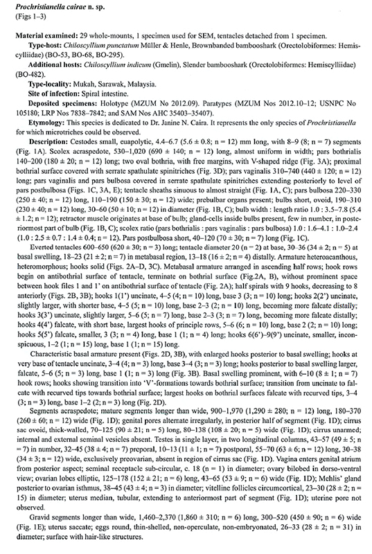 Schaeffner, B. C. and I. Beveridge. 2012. Prochristianella Dollfus, 1942 (Trypanorhyncha: Eutetrarhynchidae) from elasmobranchs off Borneo and Australia, including new records and the description of four new species. Zootaxa 3505: 1-25. (6085) Download PDF |