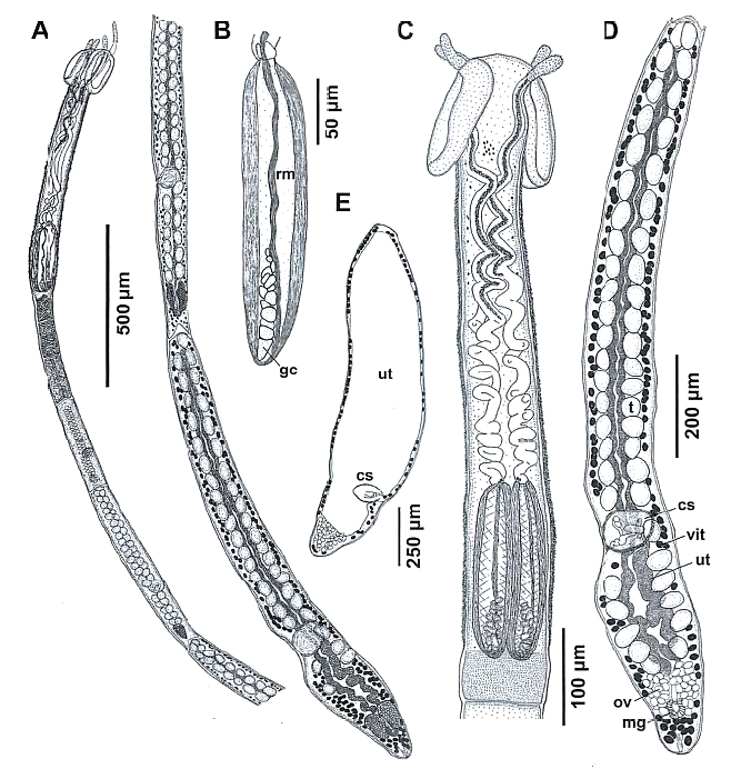 FIGURE 1. Prochristianella cairae n. sp. from Chiloscyllium punctatum (A-C, E) and C. indicum (D). A. Complete specimen. B. Bulb. C. Scolex. D. Mature segment. E. Gravid segment. Abbreviatinos: cs, cirrus sac; gc, gland-cells; mg, Mehlis' gland; ov, ovary; rm, retractor muscle; t, testis; ut, uterus; vit, vitelline follicle.