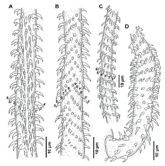 FIGURE 2. Prochristianella cairae n. sp. from Chiloscyllium punctatum. Tentacular armature. A. Metabasal region, antibothrial surface. B. Metabasal region, bothrial surface; not opposing surface to (A) of the same tentacle. C. Distal region, internal surface. D. Basal region, external surface.