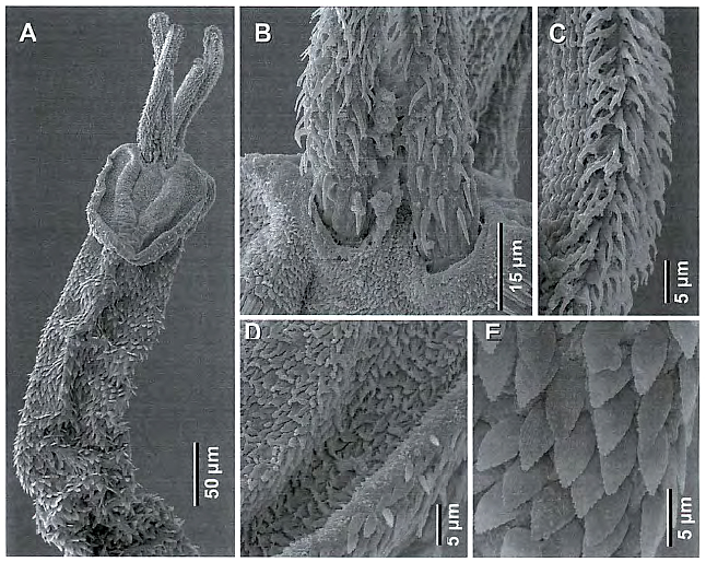 FIGURE 3. Prochristianella cairae n. sp. from Chiloscyllium punctatum. Scanning electron micrographs. A. Scolex in dorso-ventral view. B. Basal region, bothrial tentacular surface. C. Metabasal region, external tentacular surface. D. Lateral margin of bothrium, showing serrate spathulate spinitriches on proximal bothrial surface. E. Serrate spathulate spinitriches on pars vaginalis.
