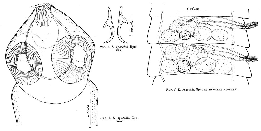 Fig. 2. 2 – scolex; 3 – rosellar hooks; 4 – hermaphroditic mature proglottids.