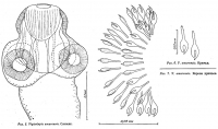 Fig. 1. 5 – scolex; 6 – rosellar hooks; 7 – crown of rosellar hooks.