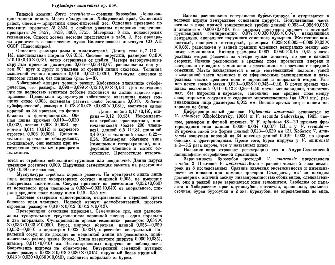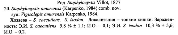 Karpenko, S.V. 1984b. [Two new Hymenolepididae (Cestoda: Hymenolepididae) from shrews of the Khanarovsk Territory] . In Izvestiya Sibirskogo Otdeleniya Akademii Nauk SSSR, Seriya Biologicheskikh Nauk, Vol. 3, . Nauka, Novosibirsk, 117-124 pp. (6091) Download PDFKarpenko, S.V. 2004. [Helminths of shrews in the Khabarovskiy Krai]. In Materials of the All-Russian scientific-practical conference dedicated to the 65th anniversary of the Khabarovskiy Kkrai, Khabarovsk, 80–86 pp. (6092) Download PDF |