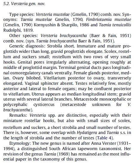 | Type Species | Versteria mustelae (Gmelin, 1790) Nakao et al., 2013 |