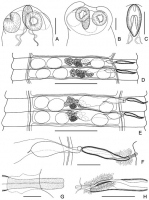 Fig. 1. Hymenolepis apodemi sp. nov. A – holotype, dorsoventral view of scolex; B - paratype 18.31.4.30, dorsoventral view of retracted scolex; C – holotype, rostellar pouch; D – paratype 18.31.4.30, ... MoreFig. 1. Hymenolepis apodemi sp. nov. A – holotype, dorsoventral view of scolex; B - paratype 18.31.4.30, dorsoventral view of retracted scolex; C – holotype, rostellar pouch; D – paratype 18.31.4.30, male mature proglottids; E – holotype, hermaphroditic mature proglottids; F –holotype, genital ducts; G – holotype, cirrus; H – vagina. Scale bars: A, B, C, F, H = 100 μm; D, E = 500 μm; G = 20 μm |