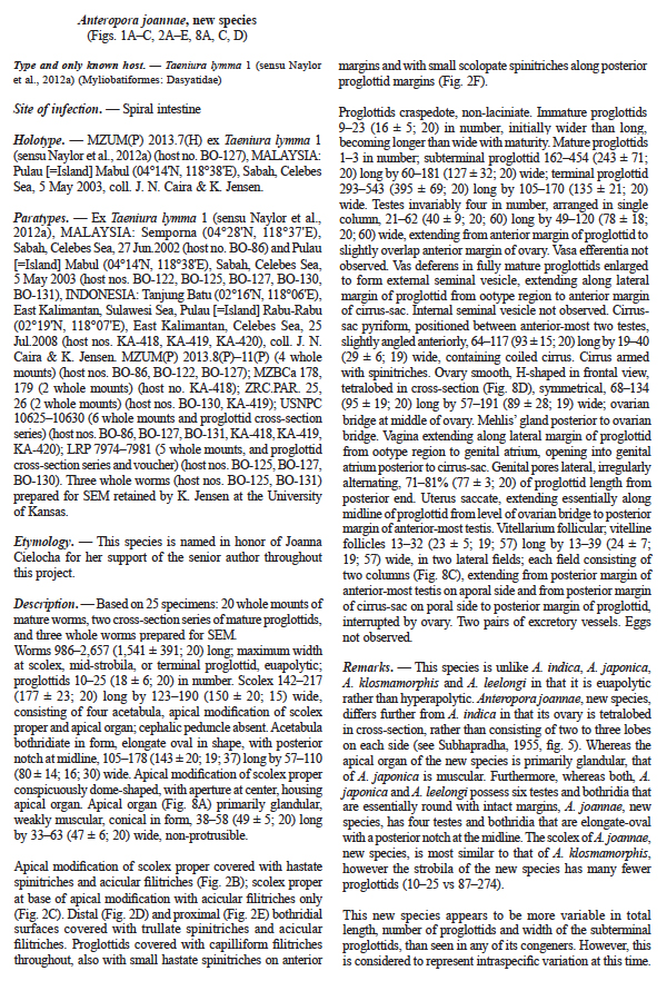 Mojica, K. R., K. Jensen, and J. N. Caira. 2013. Revision of Anteropora (Cestoda: Lecanicephalidea) and descriptions of five new species from stingrays (Myliobatiformes: Dasyatidae) in Borneo. Raffles Bulletin of Zoology 61(2): 491–506.