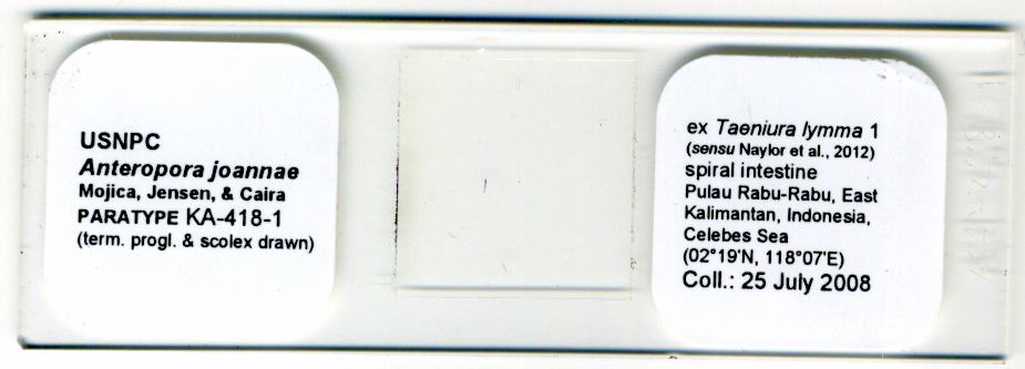 Total Number of Type Specimens 25 specimens: 20 whole mounts of mature worms, two cross-section series of mature proglottids, and three whole worms prepared for SEM