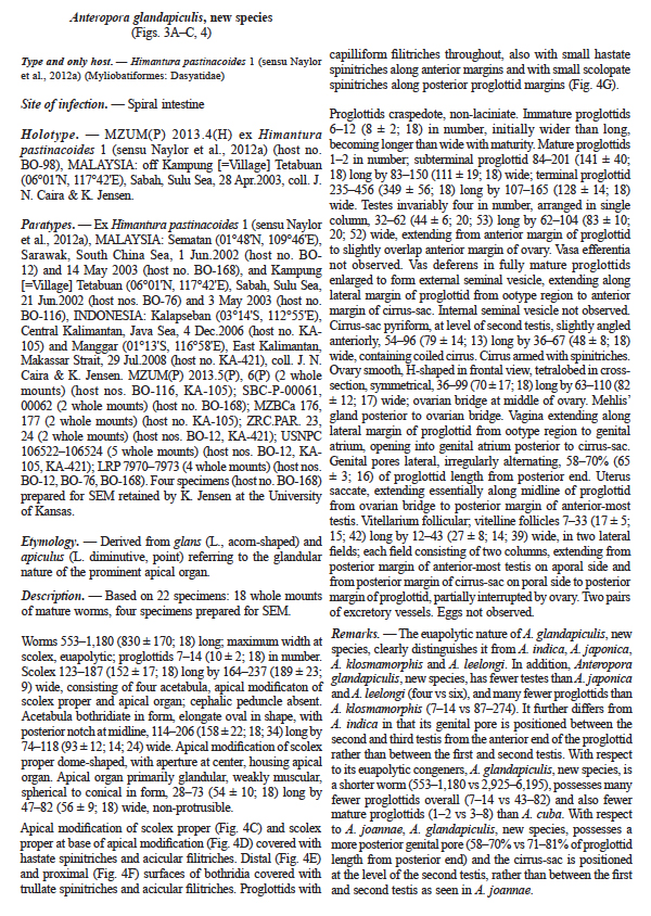| Type Material | Holotype: MZUM(P) 2013.4(H) Paratypes: MZUM(P) 2013.5(P), 6(P) (2 whole mounts); SBC-P-00061, 00062 (2 whole mounts); MZBCa 176, 177 (2 whole mounts); ZRC.PAR. 23, 24 (2 whole mounts); USNPC 106522–106524 (5 whole mounts); LRP 7970–7973 (4 whole mounts); 4 specimens prepared for SEM retained by K. Jensen at the University of Kansas |