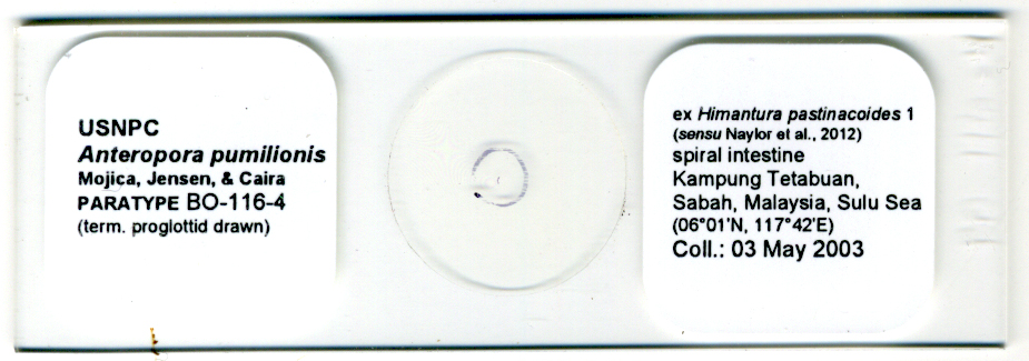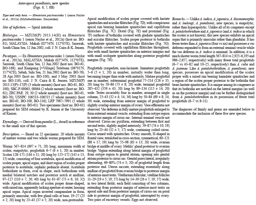 | Type Material | Holotype: MZUM(P) 2013.14(H) Paratypes: MZUM(P) 2013.15(P)–17(P) (3 whole mounts); SBC-P-00063, 00064 (2 whole mounts); ZRC.PAR. 29, 30 (2 whole mounts); USNPC 106533–106535 (7 whole mounts); LRP 7987–7991 (5 whole mounts); 2 specimens prepared for SEM retained by K. Jensen at the University of Kansas |