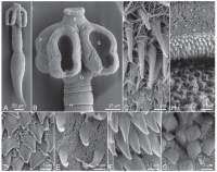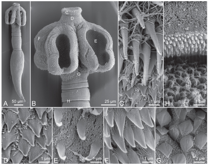 Fig. 7. Scanning electron micrographs of Anteropora pumilionis, new species. A, whole worm; B, scolex (small letters indicate location of details in C–H); C, surface of raised rim of apical modifi cation of scolex proper; D, surface of apical modifi cation of scolex proper; E, distal bothridial surface; F, proximal bothridial surface; G, surface of scolex proper posterior to bothridia; H, surfaces at boundary between
