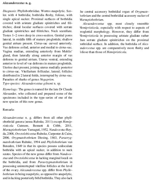 | Type Species | Alexandercestus gibsoni Ruhnke and Workman, 2013 |
