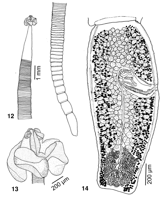 Figs. 12–14 Alexandercestus manteri n. sp. 12. Entire holotype (USNPC No. 106390). 13. Scolex of holotype (USNPC No. 106390).