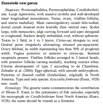 | Type Species | Essexiella fimbriata (Essex, 1928) Scholz, de Chambrier, Mariaux & Kuchta, 2011 |