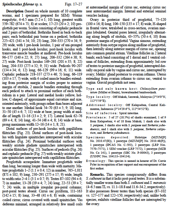 Desjardins, L. and J. N. Caira. 2011. Three new species of Spiniloculus (Cestoda: Tetraphyllidea) from Chiloscyllium punctatum (Elasmobranchii: Orectolobiformes) off Borneo with clarification of the identity of the type of the genus. Folia Parasitologica 58(1): 55-68. (6188) Download PDF |