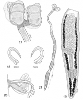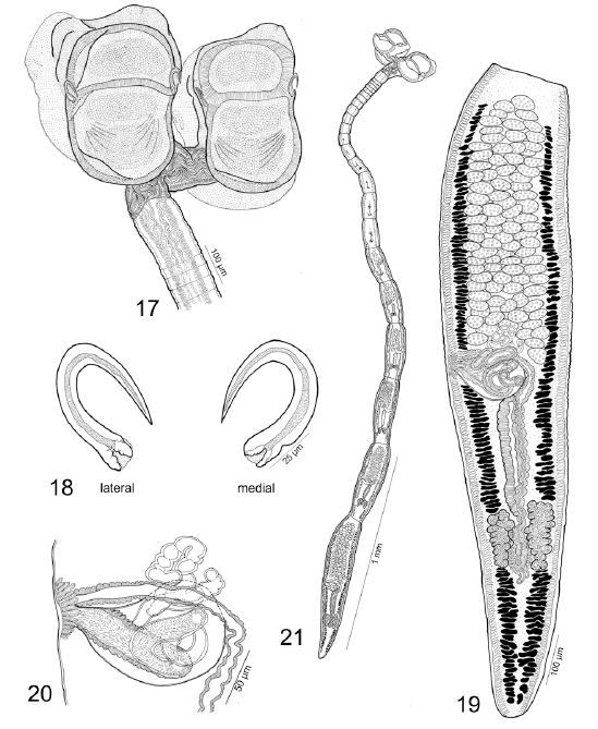 Figs. 17-21. Line drawings of Spiniloculus fylerae sp. n. Fig. 17. Scolex (MZUM[P] No. 2010.47(H)). Fig. 18. Hooks (LRP No. 7570). Fig. 19. Terminal proglottid (USNPC No. 104134). Fig. 20. Detail of terminal genitalia (USNPC No. 104134). Fig. 21. Whole worm (USNPC No. 104134).