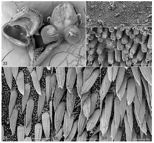 Figs. 22-27. Scanning electron micrographs of Spiniloculus fylerae sp. n. Fig. 22. Scolex. Note: small numbers correspond to the figures showing higher magnification images of these surfaces. Fig. 23. Distal surface of pre-hook bothridial loculus. Fig. 24. Distal surface of post-hook bothridial loculus. Fig. 25. Proximal surface of bothridium. Fig. 26. Surface of pedicel. Fig. 27. Surface of cephalic peduncle. Scale bars: Fig. 22 = 100 μm; Figs. 23–27 = 2 μm.