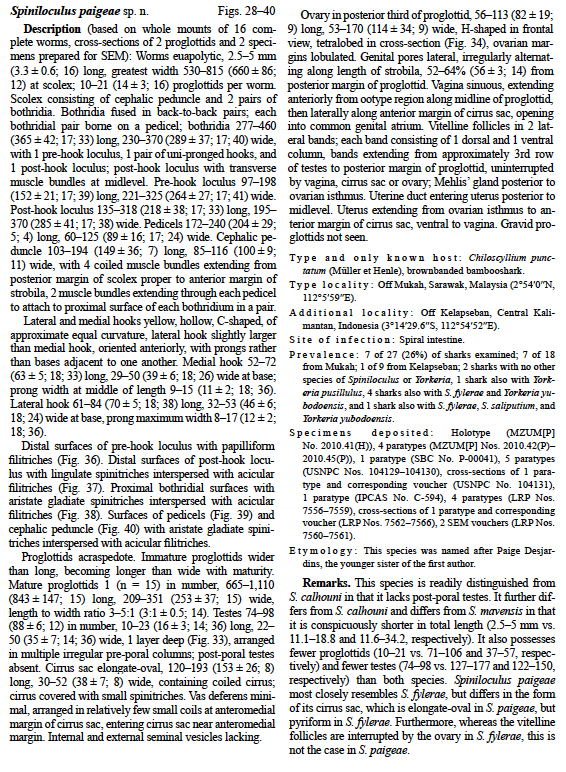 Desjardins, L. and J. N. Caira. 2011. Three new species of Spiniloculus (Cestoda: Tetraphyllidea) from Chiloscyllium punctatum (Elasmobranchii: Orectolobiformes) off Borneo with clarification of the identity of the type of the genus. Folia Parasitologica 58(1): 55-68. (6188) Download PDF |