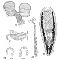 Figs. 28-32. Line drawings of Spiniloculus paigeae sp. n. Fig. 28. Scolex (USNPC No. 104129). Fig. 29. Hooks (MZUM[P] No. 2010.41(H)). Fig. 30. Terminal proglottid (MZUM[P] No. 2010.41(H)). Fig. 31. Detail of terminal genitalia (MZUM[P] No. 2010.41(H)). Fig. 32. Whole worm (MZUM[P] No. 2010.41(H)).