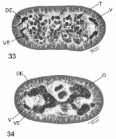 genitalia. Fig. 34. Section through ovary. Abbreviations: DE – dorsal excretory duct; O – ovary; T – testis; V – vitelline follicle; VE – ventral excretory duct.