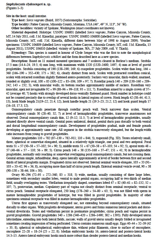Tkach, V. V., A. A. Makarikov, and J. M. Kinsella. 2013. Morphological and molecular differentiation of Staphylocystis clydesengeri n. sp. (Cestoda, Hymenolepididae) from the vagrant shrew, Sorex vagrans (Soricomorpha, Soricidae), in North America. Zootaxa 3691(3): 389-400. (6200) Download PDF |