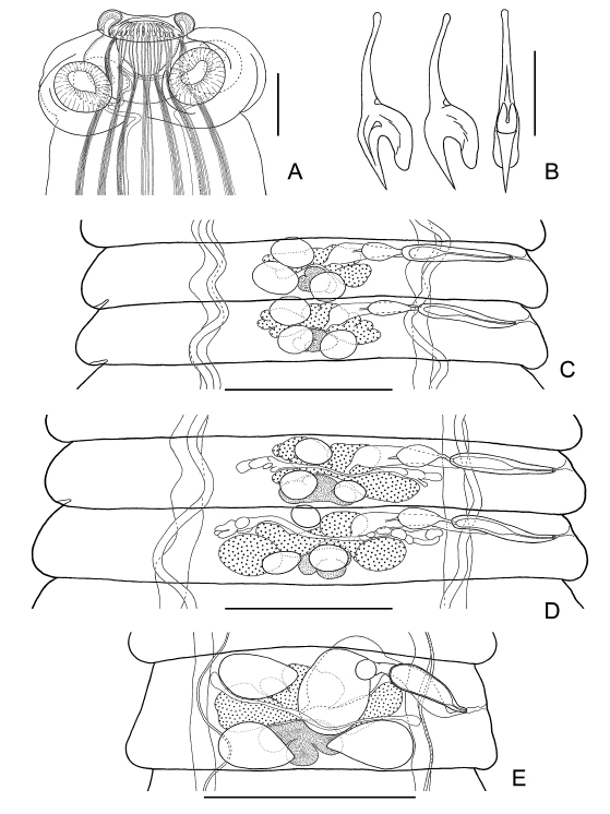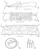 FIGURE. 1. Staphylocystis clydesengeri n. sp. A. Holotype, dorso-ventral view of scolex. B. Paratype, rostellar hooks in profile and view from posterior surface showing enlarged hook guard. C. Holotype, male mature proglottis. D. Holotype, hermaphroditic mature proglottis. E. Hermaphroditic mature proglottis of Staphylocystis schilleri from Sorex palustris. (scale bars: A = 100 μm; B = 20 μm; C–E = 250 μm).