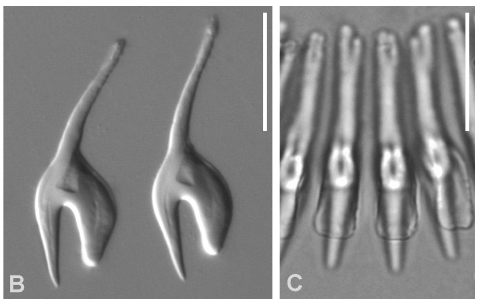 FIGURE. 3. Rostellar hooks of S. clydesengeri n. sp. B, C. Paratype of S. clydesengeri n. sp. Note that all photographs are taken at the same magnification.
