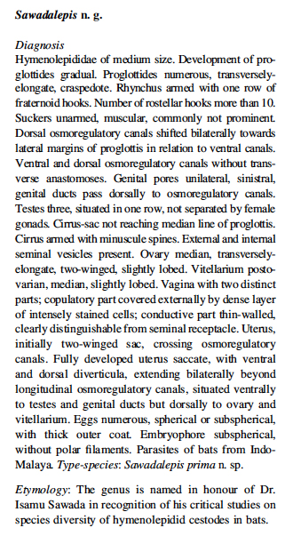 Makarikova, T. A. and A. A. Makarikov. 2013. Sawadalepis prima n. g., n. sp. (Cestoda: Cyclophyllidea) from the Schreiber’s bent-winged bat Miniopterus schreibersii Kuhl (Chiroptera: Vespertilionidae) from China. Systematic Parasitology 86: 59-68. (6203) Download PDF |