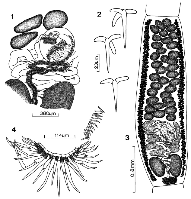 Figures 1-4. Echinobothrium euzeti sp. n. 1. Detail of reproductive terminalia. 2. Spines from anterior and posterior regions of cephalic peduncle. 3. Mature segment. 4. Rostellar armature.