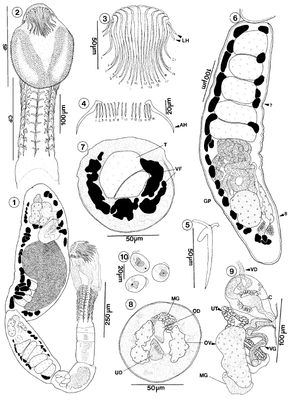 1 group of lateral hooklets. 5. Detail of cephalic peduncle spine. 6. Mature segment, rotated slightly, revealing left side and dorsal surface. 7. Cross section through segment at level indicated by arrow at 7 in Figure 6. 8. Cross section through segment at level indicated by arrow at 8 in Figure 6. 9. Lateral view of terminal genitalia. 10. Eggs. AH, apical hook; C, cirrus; CP, cephalic peduncle; GP, genital pore; LH, lateral hooklets; MG, Mehlis’ gland; VG, vagina.