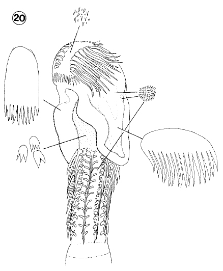 FIGURE 20. Summary of distribution of various microtrich forms on scolex of Echinobothrium hoffmanorum n. sp. All microtriches are