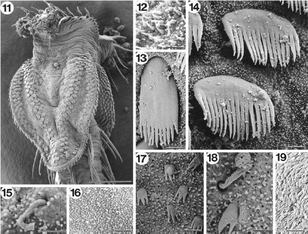 FIGURES 11–19. Scanning electron micrographs of Echinobothrium hoffmanorum n. sp. 11. Scolex proper. 12. Apex of scolex. 13. Proximal bothrial surface. 14. Distal bothrial surfaces. 15. Distal bothrial surfaces. 16. Medial distal bothrial surface. 17. Lateral portion of scolex proper. 18. Enlarged view of lateral surface of scolex proper, showing cilium. 19. Strobila. Scale bar in Figure 11, 50 um. Scale bars in Figures 12, 15, 18, 500 nm. Scale bar in Figures 13, 14, 16, 17, 19, 1 µm.